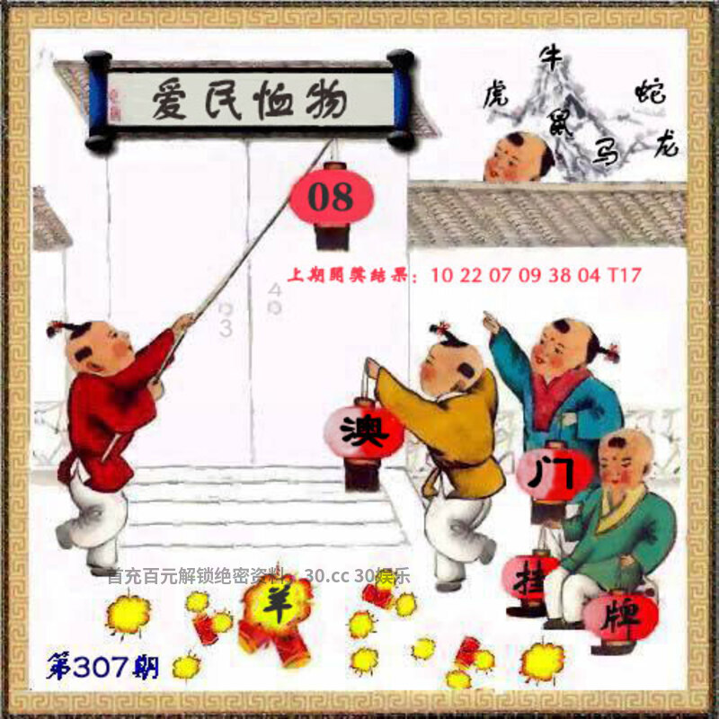 | 307期:挂牌《爱民恤物》 解释:该成语更侧重对百姓生存状态的深切关怀 解料:对百姓生存状态的深切关怀。解狗猴兔羊虎鼠,挂:08 爆:羊 七肖:羊狗猴兔虎鼠鸡 |